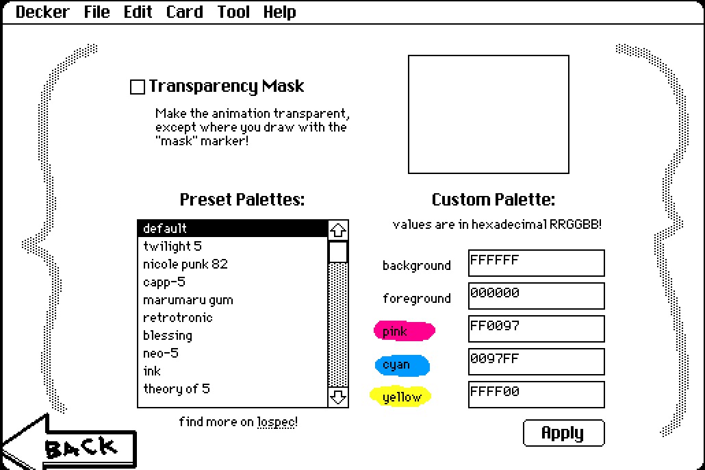 Customise background and foreground colour by using the custom palette kit. However, the default palette in Wigglypaint includes three basic colour codes of pink, cyan and yellow.